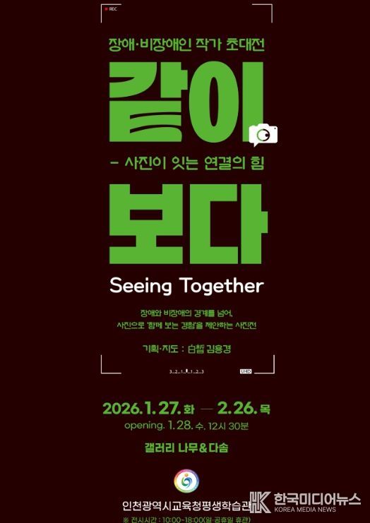 [ 한국미디어뉴스 이원영 기자 ] 인천광역시교육청평생학습관은 인천 시민을 대상으로 2층 갤러리 나무와 다솜에서 ‘같이, 보다(Seeing Together) 장애인 작가 초대전’을 개최한다.