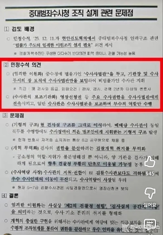 지난 12일, 국무총리 산하 검찰개혁추진단이 발표한 중대범죄수사청법과 공소청법의 입법 예고안은 국민의 요구를 철저히 무시한 처사로 비판받고 있다. 이 법안은 검찰 수사권을 완전히 박탈하겠다는 검찰개혁의 본질을 뒤집는 내용으로, 봉욱 수석이 그 배후로 지목되고 있다.