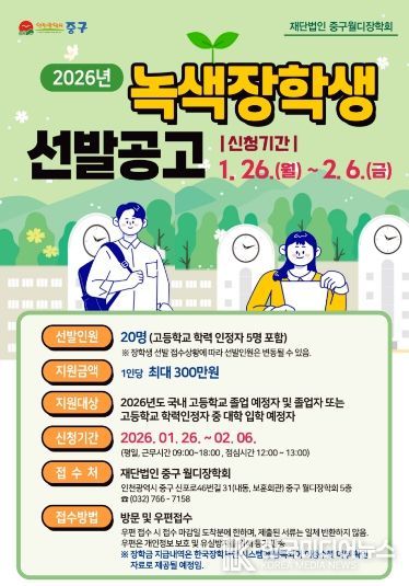 [ 한국미디어뉴스 최치남 기자 ] 재단법인 인천 중구월디장학회(이사장 김정헌)는 지역 인재 육성을 위해 ‘2026년도 녹색 장학생’ 대상자를 모집한다고 20일 밝혔다.