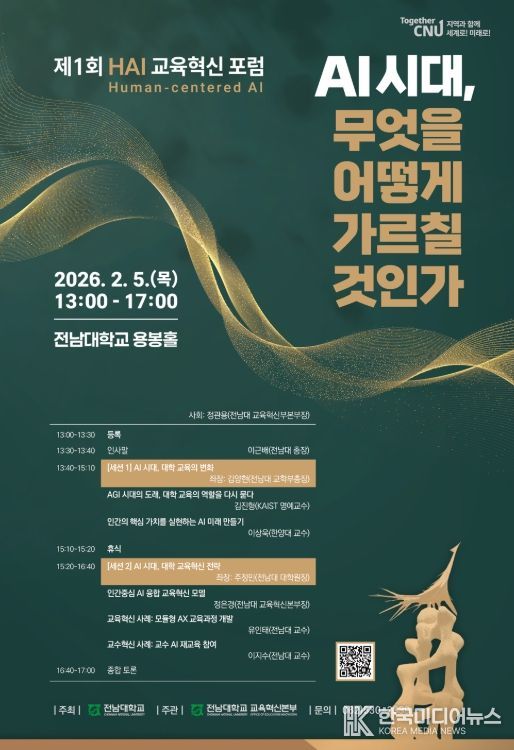 [ 한국미디어뉴스 이종철 기자 ] 전남대학교가 오는 2월 5일 오후 1시 전남대 국제회의동 용봉홀에서 ‘제1회 HAI(Human-centered AI) 교육혁신 포럼’을 개최하고, AI 시대에 대응하는 대학 교육의 새로운 이정표를 제시한다.