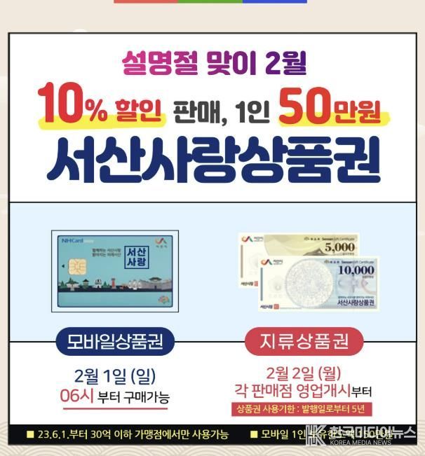 시는 2월 한시적으로 서산사랑상품권 1인당 구매 한도액을 기존 40만 원에서 50만 원으로 상향하고, 할인율은 기존과 동일한 10%를 적용한다.