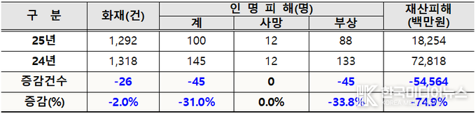 인천소방본부에 따르면, 25년 인천 내 대형 화재로 인한 '소방 대응단계' 발령 횟수는 3회로 이는 전년 대비 75% 감소한 것으로 나타났다. 화재건수는 1,292건으로 전년 대비 2.0%가 감소했고 인명피해(100명)도 전년 대비 31.0%가 감소했다. 재산피해는 182억원으로 전년대비 74.9%나 감소했다. 이는 화재 예방 대책부터 시민 교육, 현장 대응 시스템 개선까지 이어지는 촘촘한 안전망이 현장에서 실질적인 효과를 발휘하고 있는 것으로 풀이된다.