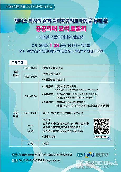 [ 한국미디어뉴스 이원영 기자 ] 인천대학교(총장 이인재)는 지역동행플랫폼(단장 홍진배 교수)이 1월 23일(금) 오후 2시 중구 대한성공회 인천 내동교회 성당에서 제23차 지역동행플랫폼 지역현안 토론회를 개최한다고 밝혔다. 이번 토론회는 ‘랜디스 박사 기념관건립의 추진의 필요성 공론화’와 인천대학교 공공의대 설립의 방안 모색을 주제로 하며, 인천대학교가 주최하고 인천대학교 지역동행플랫폼·랜디스기념사업회·인천생각협동조합이 공동 주관한다.