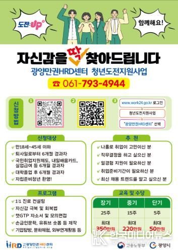 광양시 관계자는 “이번 청년도전지원사업이 취업 시장에서 멀어졌던 청년들에게 다시 한번 도전할 수 있는 계기가 되길 바란다”며 “프로그램 이수 후에도 국민취업지원제도, 일경험 사업 등 다양한 지원사업과 연계해 청년들이 안정적으로 취업에 성공할 수 있도록 적극 지원하겠다”고 밝혔다.