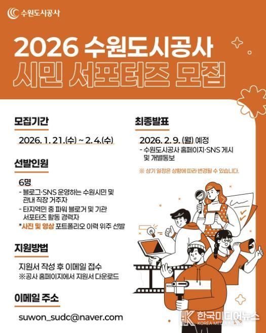 [ 한국미디어뉴스 이보영 기자 ] 수원도시공사가 21일부터 다음 달 4일까지 2026년도 제8기 시민 서포터즈를 모집한다.
