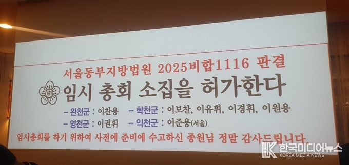 급기야 소종중 회장단 회의에서 결정하여 2025년 6월 동부지원에 임시총회 개최 신청을 하였고 13명의 이사가 찬성하여 총회일 소집 허가 신청을 받아낸 후 2026년 1월 21일 총회를 실시하게 되었다고 한다.