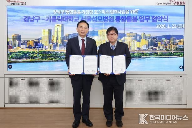 [ 한국미디어뉴스 이보영 기자 ] 꿈이 모이는 도시, 미래를 그리는 강남구가 1월 23일 구청에서 가톨릭대학교 서울성모병원과 ‘강남구 통합돌봄 가정형 호스피스 협력사업’ 추진을 위한 업무협약(MOU)을 체결했다. 이 협약은 자치구와 상급종합병원이 연계해 가정형 호스피스를 지원하는 체계를 공식화했다는 점에서 그 의미가 크다.