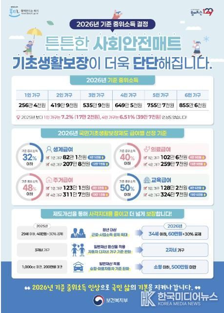2026년 기준 중위소득이 4인 가구 기준 전년 대비 6.51% 인상됨에 따라, 생계·의료·주거·교육급여 등 국민기초생활보장 급여 수준도 함께 상향 조정된다.