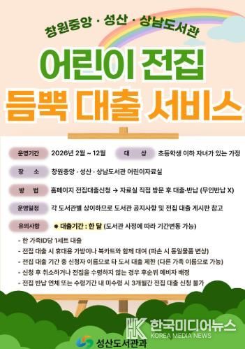[ 한국미디어뉴스 김홍철 기자 ] 창원특례시 도서관사업소 성산도서관과는 초등학생 이하 자녀를 둔 가정을 대상으로 도서 구입비 부담을 줄이고 독서 생활화를 지원하기 위해, 어린이 전집 한 세트 전체를 한 달간 대출해주는 ‘듬뿍(Book) 대출 서비스’를 운영한다고 밝혔다.