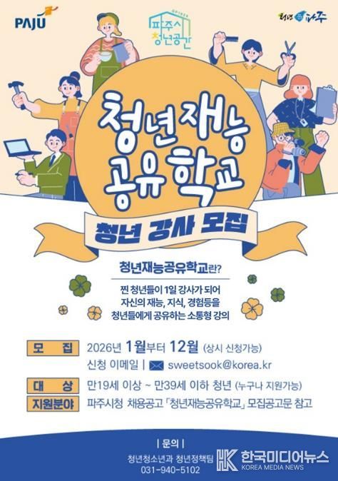 [ 한국미디어뉴스 이원희 기자 ] 파주시는 2026년 1월부터 12월까지 청년을 대상으로 '청년재능공유학교' 청년강사를 연중 상시 모집한다.