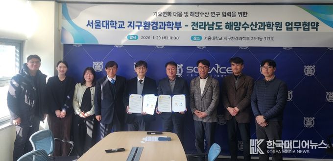 [ 한국미디어뉴스 이종철 기자 ] 전라남도해양수산과학원(원장 김충남)과 국립대학법인 서울대학교 지구환경과학부(학부장 박록진)는 29일 서울대학교에서 ‘기후변화 대응 지속 가능한 해양수산 연구 체계 구축’을 위한 업무협약(MOU)을 했다.