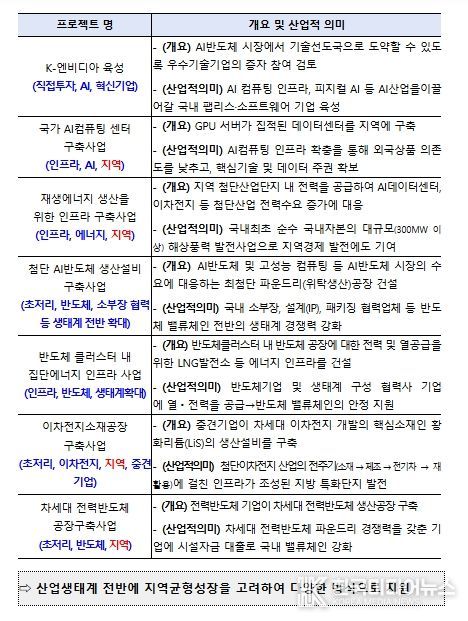 지난 12.19일 발표한 7건의 1차 메가프로젝트는 반도체 및 AI 등 첨단전략산업 및 그 생태계 발전에 파급효과가 큰 사업으로 서로 연계되어 시너지 효과를 낼 것으로 기대되며, 지역성장에 기여하는 등 산업적 의미가 큰 사업으로 구성되어 있다.