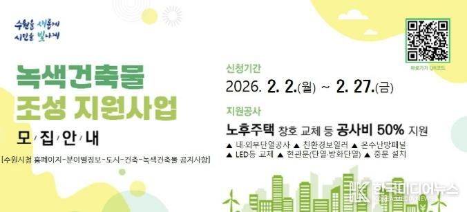 [ 한국미디어뉴스 이보영 기자 ] 수원특례시가 2월 2일부터 27일까지 ‘2026년 녹색건축물 조성 지원사업’ 신청을 받는다.