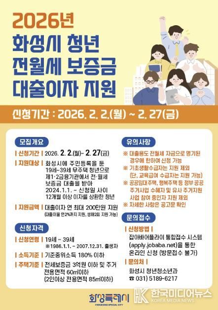 [ 한국미디어뉴스 이원영 기자 ] 화성특례시(시장 정명근)가 2일부터 오는 27일까지 청년들의 주거비 부담 경감 및 정주 여건 향상을 위해 ‘청년 전·월세 보증금 대출이자 지원사업’ 신청을 받는다.