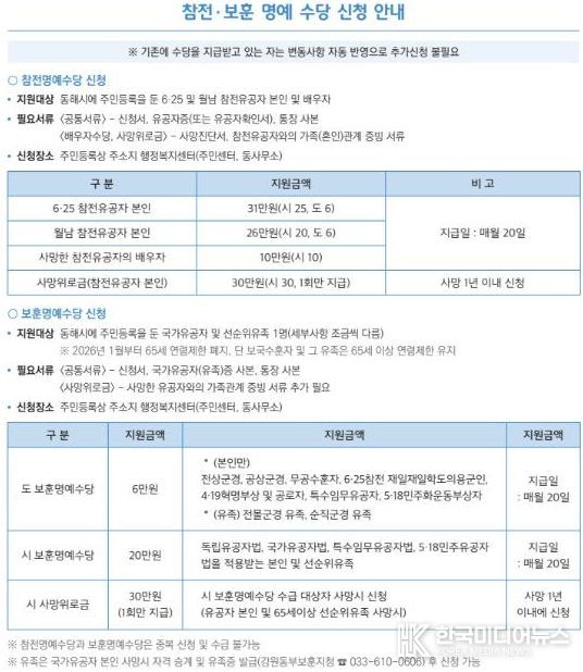 시는 2026년 1월부터 보훈 관련 수당을 인상해 경제적 지원을 확대하는 한편, 6.25 전쟁 및 월남전 참전 기념탑 건립 등 호국 정신을 기리는 보훈 선양 사업을 본격 추진할 계획이다.