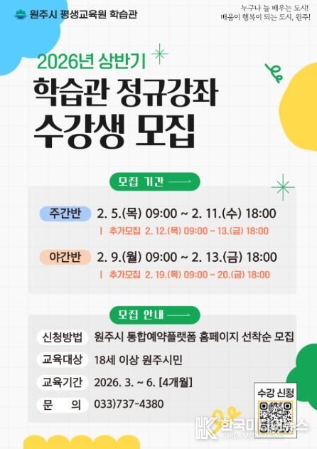 [ 한국미디어뉴스 이원영 기자 ] 원주시 평생교육원 학습관은 2026년 상반기 정규강좌 주·야간반 수강생을 모집한다.