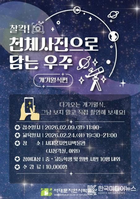 [ 한국미디어뉴스 이원영 기자 ] 서대문구가 서대문자연사박물관에서 체험형 강좌인 ‘찰칵! 천체사진으로 담는 우주 – 개기월식 편’을 마련했다고 3일 밝혔다.