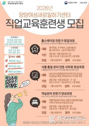 [ 한국미디어뉴스 이원영 기자 ] 양양여성새로일하기센터는 취·창업을 희망하는 여성을 대상으로 2026년도 직업교육훈련생 50명을 모집한다.