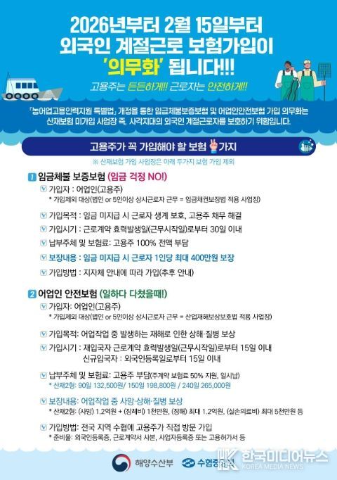 특히 이번 설명회에서는 의무보험 가입의 구체적 기준과 시점을 중점적으로 안내할 예정이다. 법 시행일(2026년 2월 15일) 이후 외국인 계절근로자를 고용하는 경우, 고용주는 ‘임금체불 보증보험’을 근로 계약의 효력발생일부터 30일 이내에, ‘농어업인 안전보험’은 근로 계약의 효력발생일부터 15일 이내에 가입해야 한다. 또한 2026년 2월 15일부터 입국하는 외국인 계절근로자는 입국한 날부터 15일 이내 ‘상해보험’에 반드시 가입해야 한다.