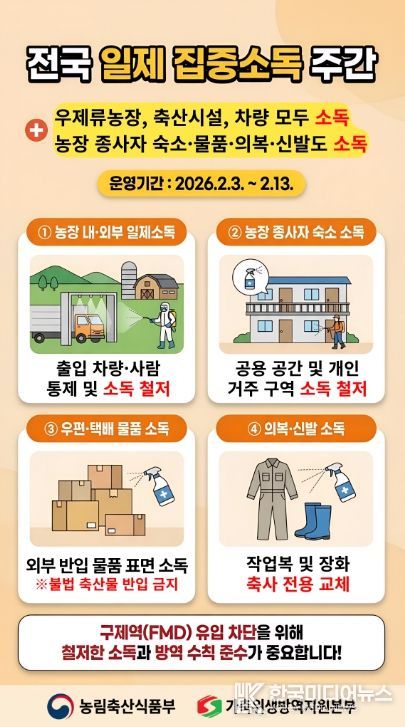 정창근 경남도 동물방역과장은 “농가에서는 백신 접종에 안심하지 말고, 도내 사육 중인 모든 우제류가 한 마리도 빠짐없이 백신을 접종할 수 있도록 철저히 관리해 달라”며, “외부인과 차량의 농장 출입을 엄격히 통제하고 매일 축사 내외부를 소독하는 등 자율 방역에 적극 동참해 줄 것”을 강력히 당부했다.