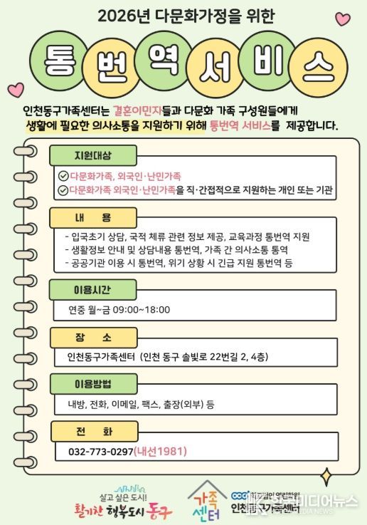 [ 한국미디어뉴스 이원희 기자 ] 인천동구가족센터는 결혼이민자의 언어 장벽을 해소하고 안정적인 한국 사회 정착을 돕기 위해 ‘결혼이민자 통·번역 무료서비스’를 운영한다고 밝혔다.