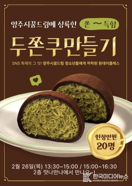 [ 한국미디어뉴스 김서안 기자 ] 양주시학교밖청소년지원센터는 지난 1월 청소년자치회의에서 나온 청소년들의 의견과 수요를 적극 반영해 ‘두바이쫀득쿠키 원데이클래스’를 오는 2월 25일 운영한다.
