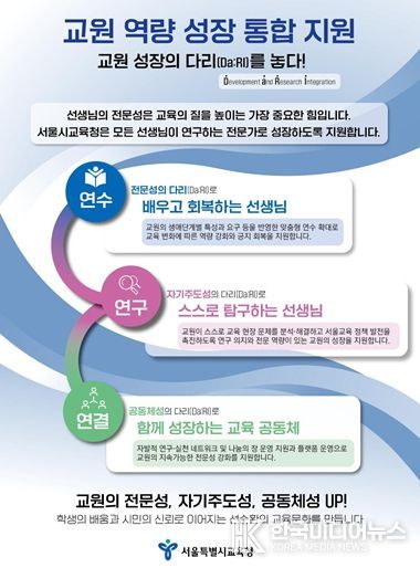 ‘교원 성장의 다리(Da:RI, Development and Research Integration)’는 연수(배우고 회복하는 선생님), 연구(스스로 탐구하는 선생님), 연결(함께 성장하는 교육공동체)의 통합 지원 체계 구축을 상징하며, 서울교육의 현재와 미래를 연결하는 다리(Bridge)를 의미한다. 구체적인 내용은 다음과 같다.