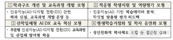 교육부는 2026년 신규 사업 공모를 통해 총 24개 내외 사업단(전문대학)을 선정하여 사업단별 최대 10억 원(총 240억 원)을 지원할 예정이다. 주요 추진 내용으로는 ▲인공지능(AI)·디지털 전환(DX) 환경 조성, ▲재학생·교직원·지역주민 맞춤형 인공지능(AI) 역량 강화, ▲대학별 특화모형 구축이 있다.