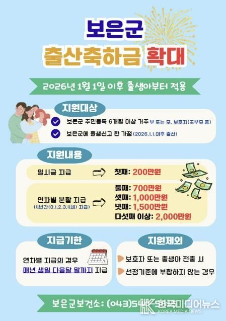 [ 한국미디어뉴스 김풍옥 기자 ] 충북 보은군은 저출생 극복과 출산·양육 가정의 경제적 부담 완화를 위해 2026년부터 출산축하금 지원을 확대 시행한다고 밝혔다.