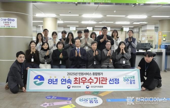 [ 한국미디어뉴스 김풍옥 기자 ] 음성군이 행정안전부와 국민권익위원회가 공동 주관한 ‘2025년 민원서비스 종합평가’에서 최고 등급을 받아 8년 연속 최우수기관으로 선정되며, 탁월한 민원행정 역량을 다시 한 번 인정받았다.
