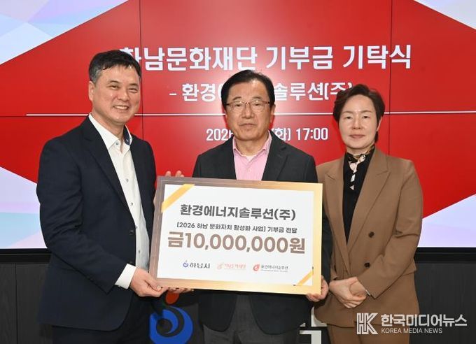 [ 한국미디어뉴스 김서안 기자 ] (재)하남문화재단은 2월 4일, 하남시청에서 환경에너지솔루션㈜으로부터 문화자치 활성화를 위한 기부금 1천만 원을 전달받았다고 밝혔다. 이날 기부식에는 이현재 하남시장을 비롯해 기업 및 재단 관계자들이 참석해 지역 상생과 ESG 실천의 의미를 공유했다.