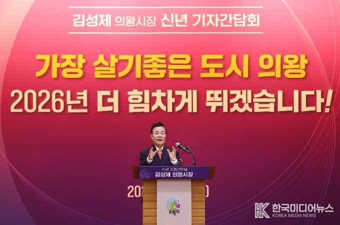 [ 한국미디어뉴스 이보영 기자 ] 김성제 의왕시장이 5일 시청 대회의실에서 2026년 신년 기자간담회를 열고 민선8기 의왕시 주요성과와 2026년 시정 운영방향에 대해 설명하는 시간을 가졌다.