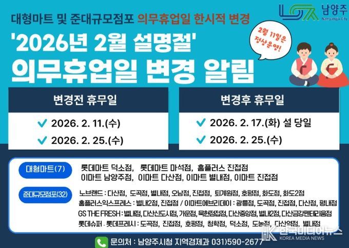 [ 한국미디어뉴스 김서안 기자 ] 남양주시는 설 명절을 맞아 관내 대형마트와 일부 준대규모점포(SSM)의 의무휴업일을 기존 2월 11일(수)에서 설 당일인 17일(화)로 한시적 변경 운영한다고 5일 밝혔다.