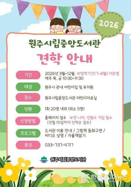 [ 한국미디어뉴스 이원영 기자 ] 원주시립중앙도서관은 오는 3월부터 12월까지 관내 유치원과 어린이집을 대상으로 도서관 견학 프로그램을 운영한다.