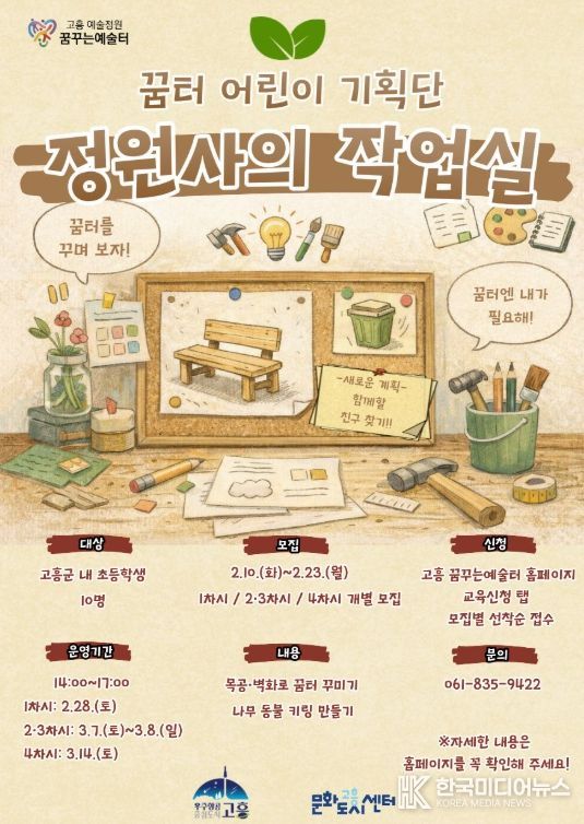 [ 한국미디어뉴스 이종철 기자 ] 고흥군은 오는 2월 10일부터 23일까지 꿈터 어린이 기획단 '정원사의 작업실'에 참여할 지역 내 초등학생 10명을 선착순으로 모집한다고 밝혔다.
