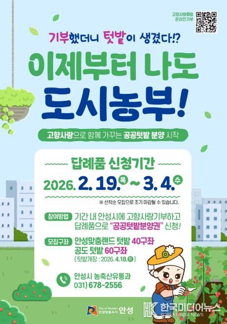 이번 공공텃밭 분양은 도심 속에서 전원생활을 꿈꾸는 출향인 등을 대상으로 안성맞춤랜드(7,388㎡)와 공도읍 용두리(7,628㎡) 등 2개소에서 진행된다. 안성시는 고향사랑기부제 답례품으로 공공텃밭 분양권을 제공해 기부와 참여형 체험을 연계한다는 계획이다.