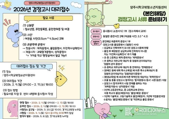 [ 한국미디어뉴스 김서안 기자 ] 양주시학교밖청소년지원센터에서는 학교 밖 청소년들을 위해 2026년 제1회 초중고 졸업 학력 검정고시 응시 원서 접수 대행을 지원한다.