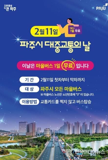 [ 한국미디어뉴스 민경환 기자 ] 파주시는 ‘대중교통의 날’을 맞아 대중교통 이용 활성화와 시민 교통비 부담 완화를 위해 오는 2월 11일 하루 동안 파주시 전 지역의 모든 마을버스를 무료로 운행한다.