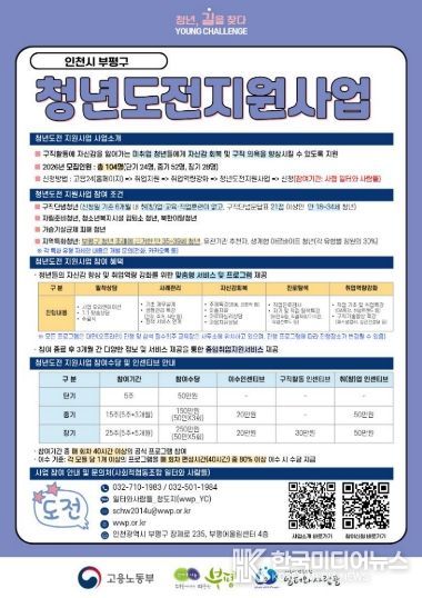 [ 한국미디어뉴스 양선희 기자 ] 부평구는 오는 10월까지 구직에 어려움을 겪고 있는 지역 청년들의 사회 재진입을 돕기 위한 ‘2026년 청년도전지원사업’ 참여자를 모집한다고 밝혔다.