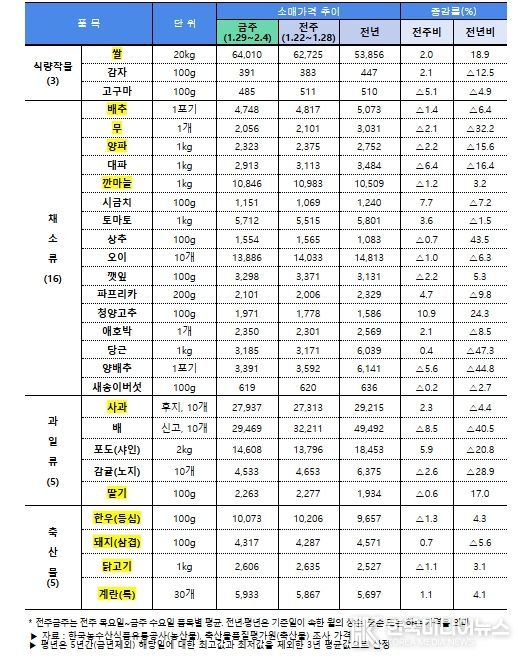 수급 점검 결과 전반적인 설 성수품 가격은 전년 수준으로 비교적 안정적인 흐름을 보이고 있고, 설 차례상 비용도 전년보다 소폭 하락했다. 다만, 대과 위주의 선물용 사과와 지난해 가격이 낮았던 쌀과 한우는 다소 높은 수준을 보이고 있다.