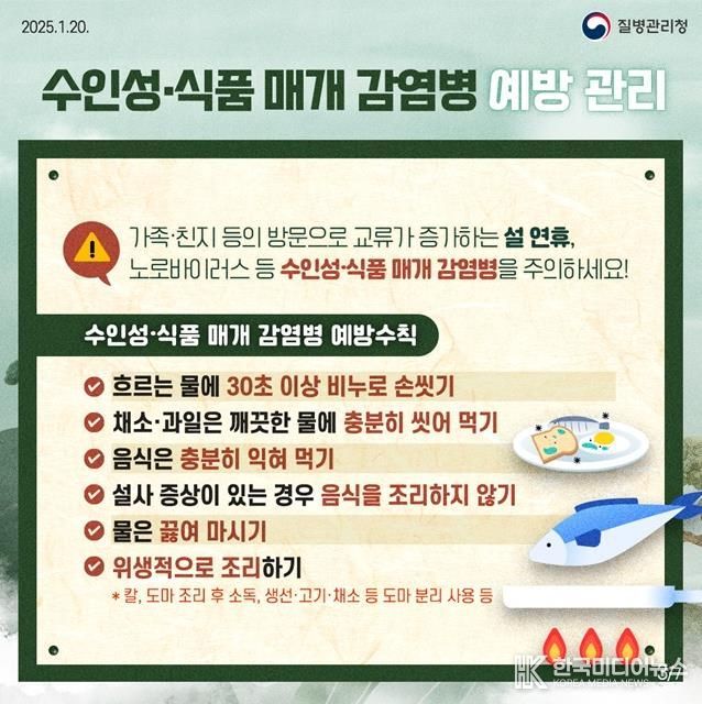 겨울철에 주로 발생하는 노로바이러스 감염증이 최근 영유아(0~6세)와 학생을 중심으로 지속적으로 발생하고 있어 각별한 주의가 요구된다. 노로바이러스는 오염된 음식물뿐만 아니라 환자와의 접촉, 비말 등을 통해서도 전파될 수 있어 많은 사람이 모이는 명절에 확산 위험이 더 높아진다. 파주보건소는 관내 어린이집, 사회복지시설 등 감염 취약시설에 예방수칙 안내문을 배포하고, 위생 관리를 철저히 해줄 것을 당부했다.
