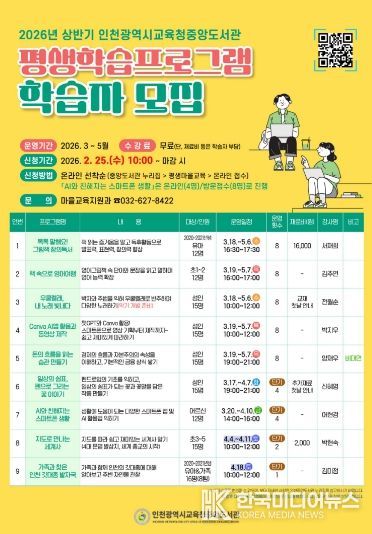 [ 한국미디어뉴스 이원영 기자 ] 인천광역시교육청중앙도서관은 주민의 평생교육 기회를 확대하기 위하여 오는 25일부터 ‘상반기 평생학습프로그램’ 학습자를 모집한다