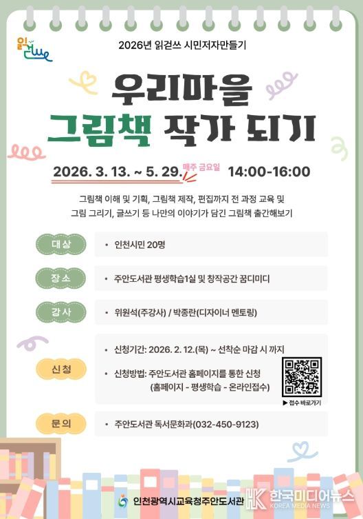 [ 한국미디어뉴스 이원영 기자 ] 인천광역시교육청주안도서관은 읽걷쓰 시민저자 양성을 위한 ‘우리마을 그림책 작가 되기’ 프로그램 참여자를 모집한다.