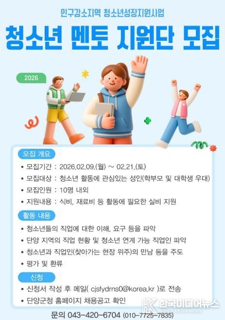 [ 한국미디어뉴스 김풍옥 기자 ] 단양군청소년수련관은 인구감소지역 청소년성장지원사업의 일환으로, 청소년의 건강한 성장과 진로 탐색을 지원하기 위한 ‘청소년멘토지원단’을 모집한다고 밝혔다.