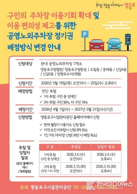 [ 한국미디어뉴스 이원영 기자 ] 영등포구가 관내 공영노외주차장 7개소에 대한 정기권 신청을 ‘선착순 순환배정제’에서 ‘구민 우선 전산추첨 순환배정제’로 변경해 오는 19일부터 25일까지 접수한다고 밝혔다.