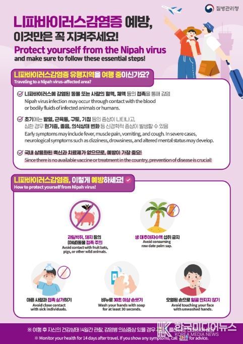 질병관리청은 지난해 9월 니파바이러스감염증을 제1급 법정 감염병으로 지정하고 국내 유입에 철저히 대비해 왔다. 아울러 인도, 방글라데시에서 환자 발생이 지속되고 치명률이 높으며, 백신·치료제가 없는 점 등을 고려하여 두 국가를 중점검역관리지역으로 지정한다.