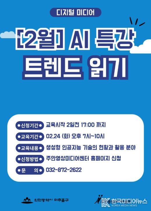 [ 한국미디어뉴스 최치남 기자 ] 인천 미추홀구(구청장 이영훈) 주안영상미디어센터가 시민들의 인공지능 기술 이해도를 높이고 일상 속 활용을 돕기 위해 ‘2월 인공지능(AI) 특별 교육 프로그램’을 운영한다.