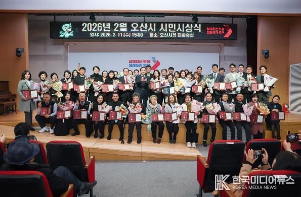 [ 한국미디어뉴스 이보영 기자 ] 오산시는 지난 11일 오산시청 대회의실에서 ‘2026년 2월 시민시상식’을 개최하고, 지역사회 발전과 이웃사랑 실천에 기여한 시민 46명을 대상으로 표창을 수여했다.