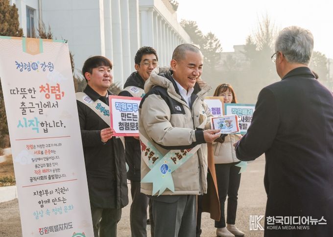 [ 한국미디어뉴스 이원영 기자 ] 강원특별자치도는 2월 12일 오전 8시 30분, 도청 본청을 비롯한 주요 청사에서 '따뜻한 청렴, 출근길 인사 캠페인'을 열고, 직원들과 함께하는 일상 속 청렴 실천 활동을 펼쳤다.