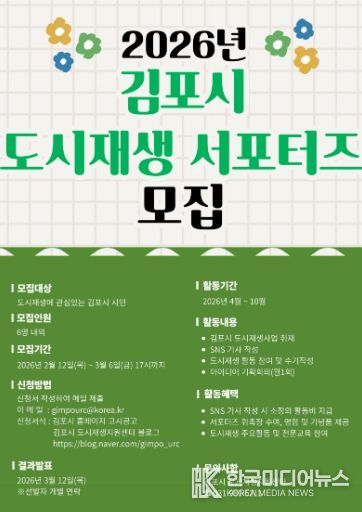 [ 한국미디어뉴스 이원희 기자 ] 김포시는 다양한 도시재생사업을 홍보하고 도시재생에 대한 시민들의 이해와 관심을 도모하고자 오는 12일부터 ‘2026년 김포시 도시재생 서포터즈’를 모집한다.